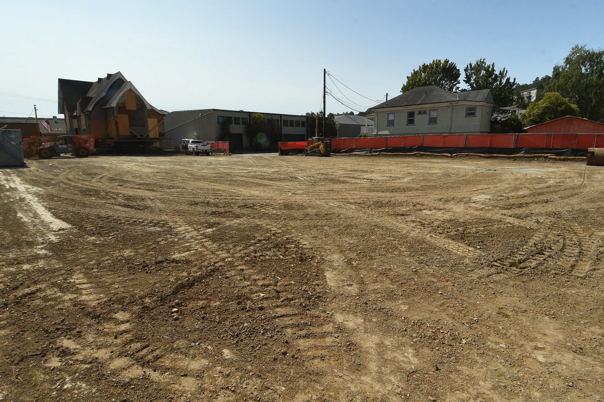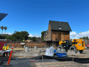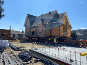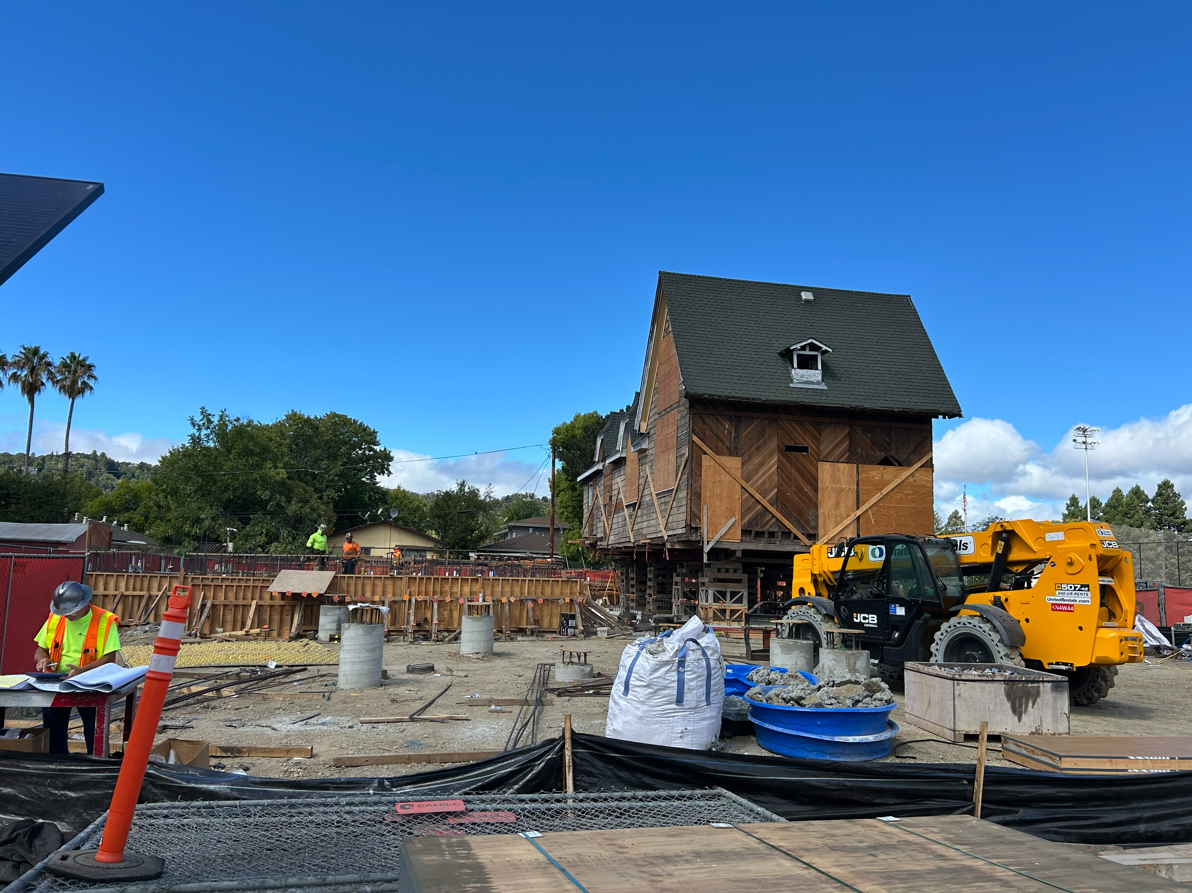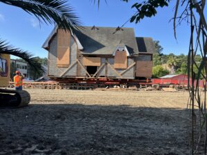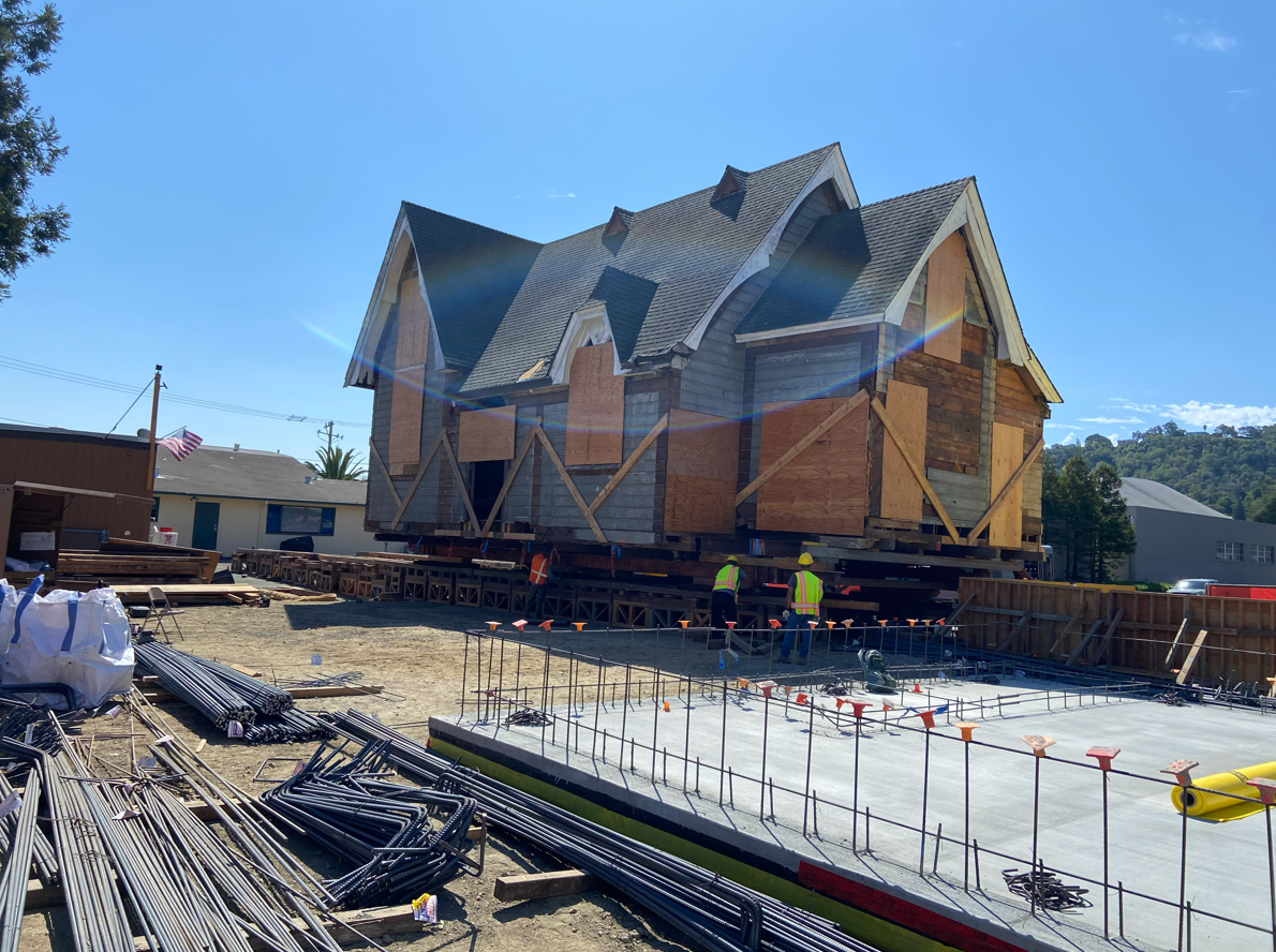 The historic building was moved (see that amazing video here!), and then moved again. It now rests in its permanent location at the front of the site.