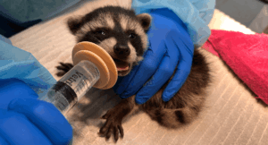 The construction workers knew this little raccoon had been alone without mom feeding her for those three days, so they brought her to WildCare. Obviously a reunite wasn’t possible because the mother had clearly left that den site, and no one knew where the new den was located.