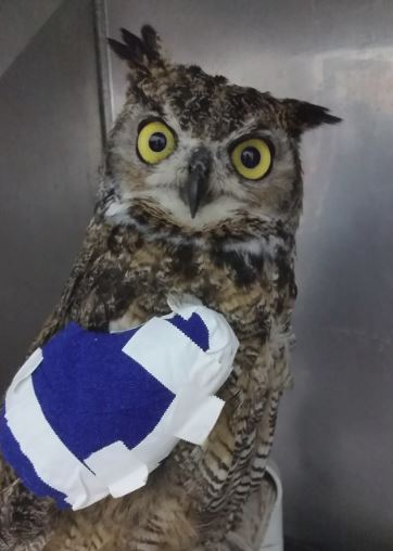 This large, and otherwise healthy Great Horned Owl was found by a Novato resident, right outside her front door. The bird had been hit by a car and was obviously severely injured.