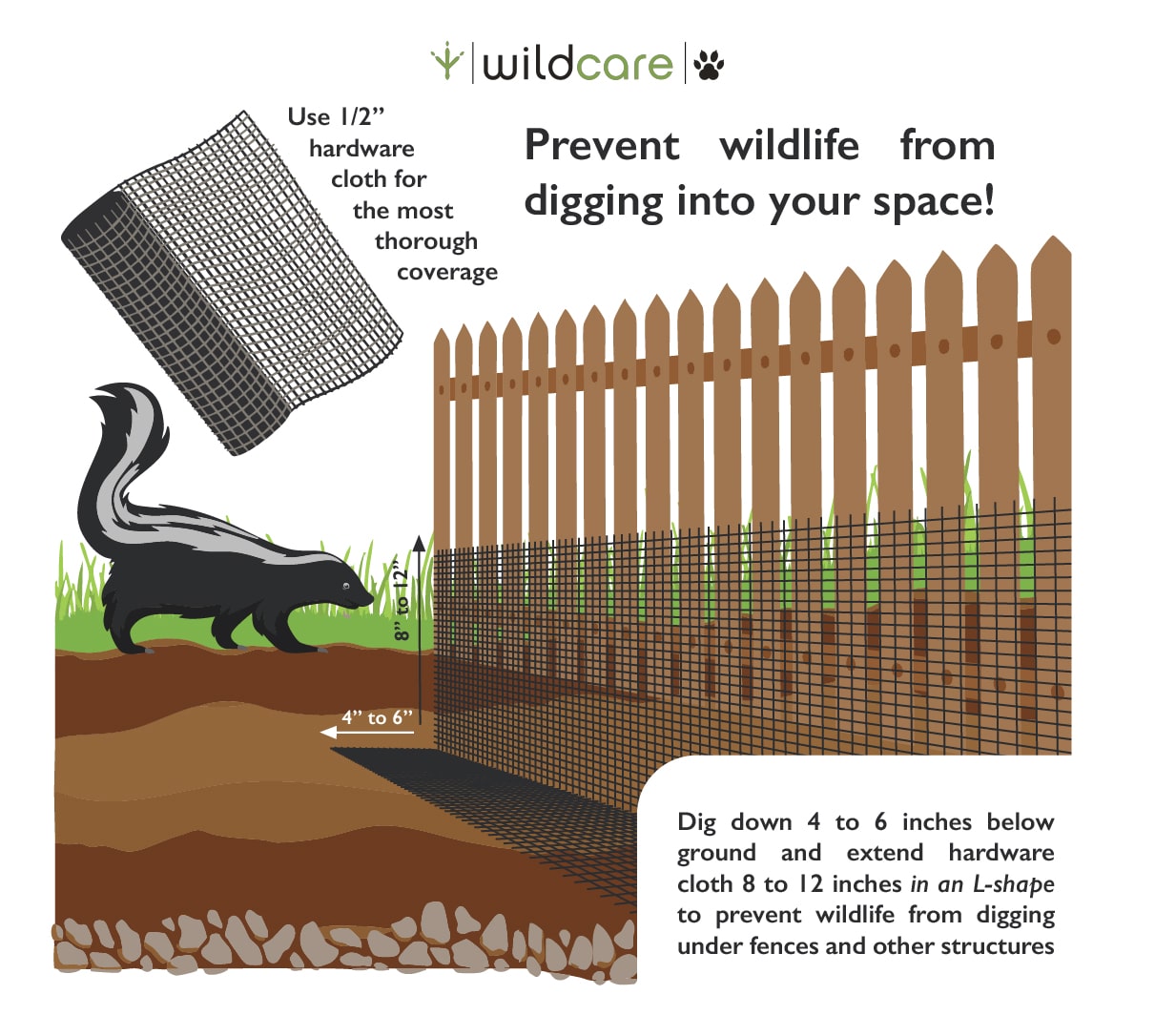 To properly seal openings and prevent skunk habitation, cover all openings with wire mesh, sheet metal, or concrete. Bury fencing in an "L" shape outward 1 1/2 to 2 feet deep in areas skunks can access by digging. Seal all ground-level openings into poultry buildings and close doors at night. Use tight-fitting lids to keep raccoons out of garbage cans, and make sure the cans can't be tipped over, which puts them at skunk level.