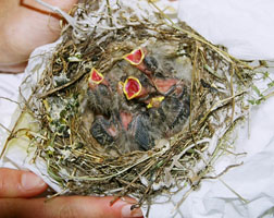 Fluffy baby birds like these cannot control their own body temperature, so they get cold fast if they fall from the nest. Photo by Melanie Piazza