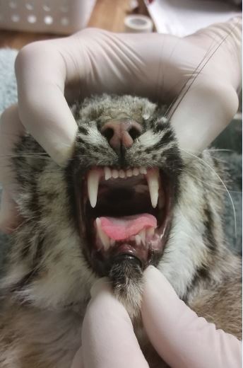 When she arrived at the Wildlife Hospital, the Bobcat was still mostly unconscious. Medical Staff was able to perform her intake exam without sedation. They started with a weight check, and then gave the cat subcutaneous fluids and pain medications. Then they palpated her entire body to check for injuries.